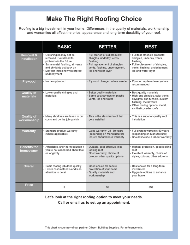 You can use this chart with your customers to show them what they get with three typical roofing options. It also helps them do an apples-to-apples comparison with quotes from other roofers.